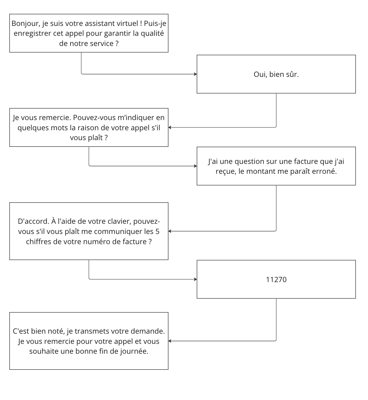 Dans cet exemple, l'assistant a compris la demande de son appelant : une demande concernant une facture. Il lui demande alors le numéro de la facture concernée (il s'agit ici d'une collecte de données prévue dans le scénario joué). Une fois les informations nécessaires collectées, l'assistant met fin à l'appel.
